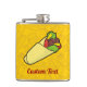 Cartoon illustration of tortilla sandwich wrap. Junk food outline icons yellow pattern background. Custom text.