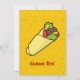 Cartoon illustration of tortilla sandwich wrap. Junk food outline icons yellow pattern background. Custom text on both sides.
