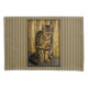Portrait photo of a  tortoiseshell american short-hair cat with a black and light orange stripe pattern on a park bench in late afternoon natural light.  The striped background was digitally created from the colours in the photo.