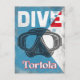 Tortola British Virgin Islands vintage scuba mask travel poster design. A blue and white diver down flag background with a retro scuba mask and word "Dive" at the top.