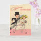 Totally retro. Pale peach and pink background with a cartoon bride and groom in tux and wedding gown hurrying through thrown confetti. The bride is blonde and carrying her bouquet. At the top are the words "Wedding " ( in script) and "Congratulations" ( not in script). Both words are in pink. The inside is the same pale peach as the from with lettering the colour of which matched the lettering on the from. The phrase inside is completely customisable. Feel free to adapt to you desires.