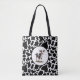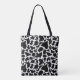 This cute stylish tote bag is shown in a black and white cow spotted print.