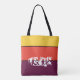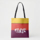 This cute stylish medium size tote bag is shown in mulberry,tangerine and yellow with a thin black stripe and handles in a striped colour block with the special text Vegas.
