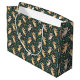 Tote bag with a playful pattern of orange and gray cats on a dark green background, decorated with small green leaves. The mood is fun and lively.