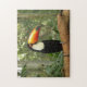 In a lush tropical rainforest, a vibrant toucan perches gracefully on a moss-covered tree branch, its striking, oversized beak contrasting brilliantly against the verdant foliage. The bird's iridescent plumage and intense gaze make for a captivating image, showcasing the beauty and exotic allure.