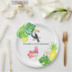 Exotic summer party celebration paper plates featuring tropical foliage and flowers, fresh fruits, a toucan and a watermelon popsicle.