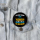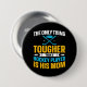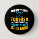 Hockey theme button for the hockey mum with hockey pucks and sticks with text of white, yellow and blue that reads The Only Thing Tougher Than a Hockey Player is His Mum!