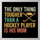 Hockey theme poster for the hockey mom with hockey puck and sticks with text of off white, gold, aqua and melon that reads The Only Thing Tougher Than a Hockey Player is His Mom!