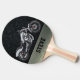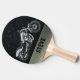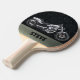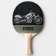 A rugged looking ping pong paddle for the motorcycle rider. The design features a motorcycle on a diamond plate background. The bottom of the paddle has a stripe of black coloured chrome that includes the personalisation of a name.