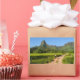Rectangular photo sticker with a female tourist cycling on a dirt road with Rotui mountain in the background on the tropical island of Moorea, near Tahiti, in French Polynesia.