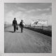 Two people walking along road, heading towards Los Angeles, California, near a billboard that says "Next time, try the train. Relax." Photo by Dorothea Lange, March 1937.