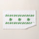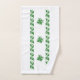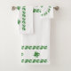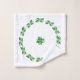 Holly leaves in green. Ribbons of leaves/branches frame clusters of crossed branches in centre. Wash cloth shows single cluster in circle of leaves. Hand towel shows three clusters between two rows of leaves. Bath towel replicates the design on hand towel at top, bottom and centre.