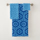 Hexagon image is tiled in a mosaic pattern. Bath towel is dark image on light background, hand towel and washcloth are light image on dark background.