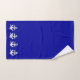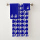 White ship's anchor is replicated multiple times against a the dark blue background on bath towel. Single anchor in corner of wash cloth. Four anchors on one end of hand towel.