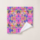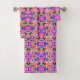 Towel set with vibrant, colorful geometric floral patterns in pink, blue, and orange. The lively design conveys a cheerful and lively tone.