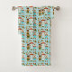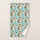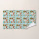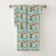 Towels and a washcloth feature a playful, colorful pattern of cartoon mice in traditional clothing with floral accents on a pastel blue background.