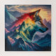 The illustration features a striking wolf silhouette merging with majestic mountains to form the outline of a wolf's head. A rich array of vibrant colours including red, gold, blue, purple, and green come together to create a mesmerising effect. The backdrop of a cinematic sky suggesting a sunset casts warm tones over the mountains, adding to the overall visual allure of the scene.
