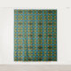 A vibrant pattern features repeated square motifs in green, yellow, and blue hues, creating a kaleidoscopic effect. The design has a symmetrical layout, reminiscent of a woven or tapestry-like appearance.