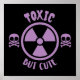This playful design features a purple warning symbol flanked by two skulls and crossbones with the phrase TOXIC BUT CUTE in fun stylised text. Tags: toxic, cute, purple, warning, skulls, crossbones, symbol, radioactive, poison, radiation, danger, humourous, funny, text, design