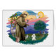 The patron saint of animals and a loved figures that crosses denominational lines, St. Francis is shown here with a Toy white Poodle. The figure of Saint Francis itself was adapted from Giotto's 14th century masterpiece and a new background was created by Jean Fitzgerald