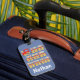 Colourful personalised kid's luggage tag with red train hauling the entire alphabet.
