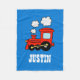 Red toy choo choo train personalised fleece blanket for kid. Cute comforter personalised with kids name, quote or monogram letters. Cute locomotive design for little boys. Make one for son, grandson, new baby, grandchild, nephew etc. Fun cartoon illustration for children. Railroad theme. Baby shower and 1st Birthday gift ideas for children.