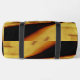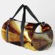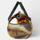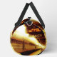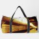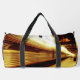 In the original photograph by ZoeSPEAK on this Duffel Bag, passengers in the distance disembark from the train stopped on Track 2. Bright sunlight strikes the top of the shiny metal train, and a sign with the date and time can be seen hanging under the platform roof, with the rest of the train and platform in shadow. The artwork has been done in gold tones.