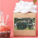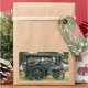 A photographic design of a green vintage steam traction engine.