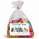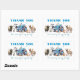 Farm animals birthday party thank you favour bag stickers. Horizontal, rectangular white stickers with farm theme design. A blue tractor is the centre of the design which includes many barnyard animals. A bull, donkey, cow, lamb, pig, bunny, as well as a puppy, cat and bird. Text is blue, and the background is white. Add to favour bags and thank friends for coming.
