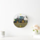 The clock did not take as long to arrive as I thought it might and was extremely well packaged. I didn't do the measurements so I didn't realize it is a little smaller than the average clock but that does not matter (just make sure you check if that's important to you).It is really nifty! It seems very solid and well made not flimsy at all. It has been going well and has kept good time in its few weeks on my wall. Nice product. Gets noticed too! Nicer in real life than the picture but true to the picture
