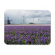 Souvenir magnet with a landscape with a traditional windmill and multiple modern windmills to generate green energy behind a field with purple hyacinth flower in the Bulb Region in Holland.
