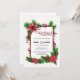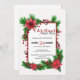 Classic and stylish Christmas elegant dinner party invitation with fir branches and poinsettia flowers around a red frame on the front side and a Christmas wreath on the back.