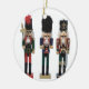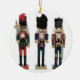 This tree ornament features three colourful, traditional, wooden Christmas Nutcracker soldiers, one with an axe, one with cymbals, and one with a sword.