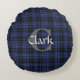 Add a classic touch to any room, with this custom monogrammed traditional Scottish tartan round accent pillow. The classic blue, grey, and black Clark clan plaid pattern covers both sides of this stylish throw pillow. The front of the pillow, has a large grey one letter monogram and white text, both ready to personalise. Great gift idea!