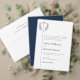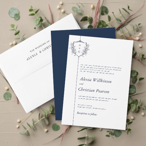 The main focal point of this formal wedding invitation is the beautifully designed header. A floral wreath motif surrounds the initials "A" and "C", which can be edited to suite your own needs. The simplicity and sophistication of thebright white background, paired with navy text text, creates an atmosphere of refined elegance that is sure to impress your guests.