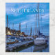 Painting of traditional fishing village in the evening. View of Volendam harbor and yachts, boats and sailing boats anchored in Netherlands. Marine with illuminated houses and blue sky