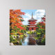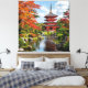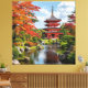 A serene Japanese architectural landmark amid vibrant red and orange foliage reflected on a calm pond. The clear blue sky enhances the peaceful scenery, symbolising tranquillity and the beauty of traditional culture.