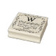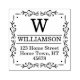 A traditional square personalised self-inking stamp design featuring a decorative retro border with elegant typographic ornaments, monogram initial, name and return address text.