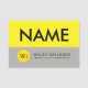 Custom name tag with original pin back. Featuring bright yellow and light grey with custom company logo.