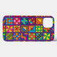 Lively and colourful cell phone case containing traditional, hand-drawn quilt blocks in bright and cheery colours.