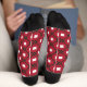 The pair of socks has a traditional red, white, and green Christmas pattern.
