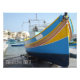 Malta poster. Colourful striped fishing boat in Marsaxlokk harbour, a traditional fishing village in Malta