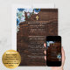Rustic wood with dusty blue flowers, a gold cross, classic elegant arch frame design with parents names and scripture (can be edited) by LeahG.