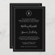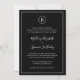 Simple Wedding Invitation with your monogram in a circle at the top and your wedding details surrounded by a thin border. Your names are in an elegant handwritten script font. All design elements are in white over a black background and may be changed in the design editing tool. The classic, traditional layout makes this invitation great for a formal wedding.
