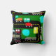 This throw pillow has a geometric design of trucks and cars on a road and in a parking lot.