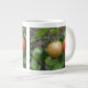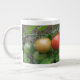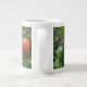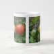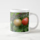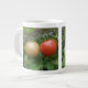 This awesome mug features a photograph of a bunch of ripening tomatoes including a red, orange and green cherry tomato in a line, growing on a tomato plant in a suburban garden. The photograph was taken using macro photography for a detailed result.