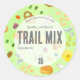 A bright sticker decorated with a variety of ingredients that can go in a trail mix blend such as pretzels, nuts, oats, bananas and other fruit illustrated with pencil and watercolor on a lime green background with text curved around the edges that can be edited with your personal or business information.
