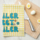 Cute kitchen towels for those embracing the trailer life! Aqua "trailer sweet trailer" text with added flowers on yellow harlequin pattern background