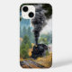 colour image of an approaching steam train on the train tracks billowing grey smoke from its stack