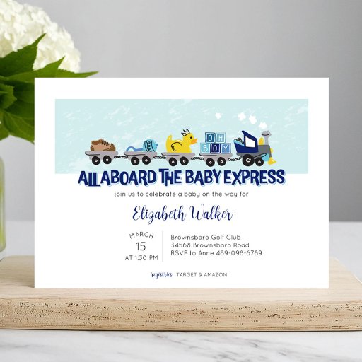 A Books for Baby Enclosure card for a train theme baby shower. Design features a hand drawn train with baby items. This typography driven design is super easy to customise using the template provided.